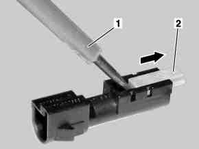 7 Gently pull the respective line to remove the contact pin (2) from the connector (1).