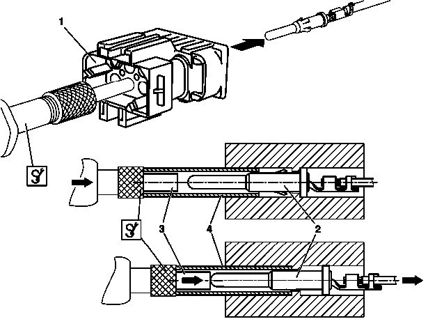 6 Press contact pin (2) from its seat in housing using plunger (3) on release tool with RK 2.5 ejector against spring force of tool.