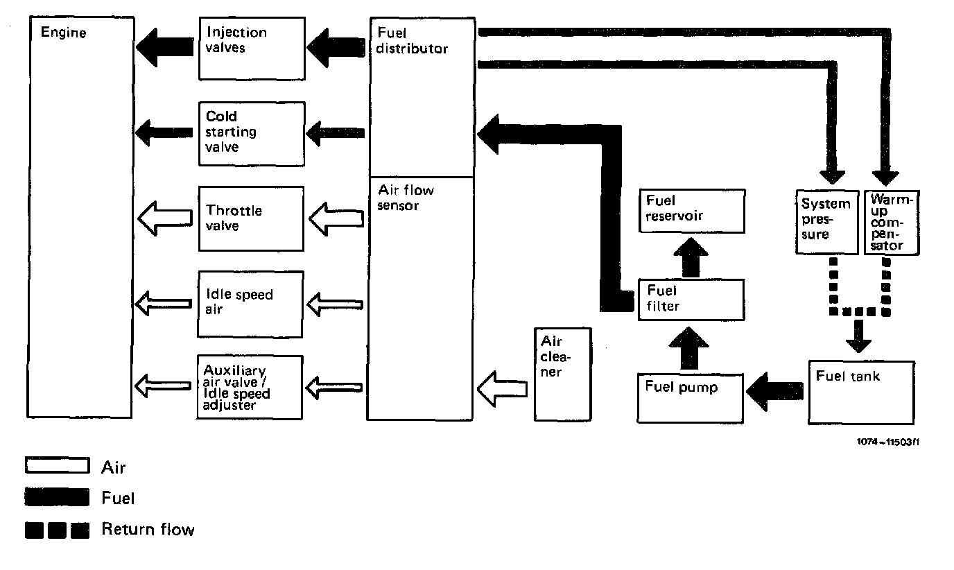 The air aspirated by the engine is controlled by means of throttle valve and is measured with an air flow sensor installed prior to throttle valve. The fuel distributor dispenses the respective fuel quantity to the individual engine cylinders in accordance with the air volume measured.