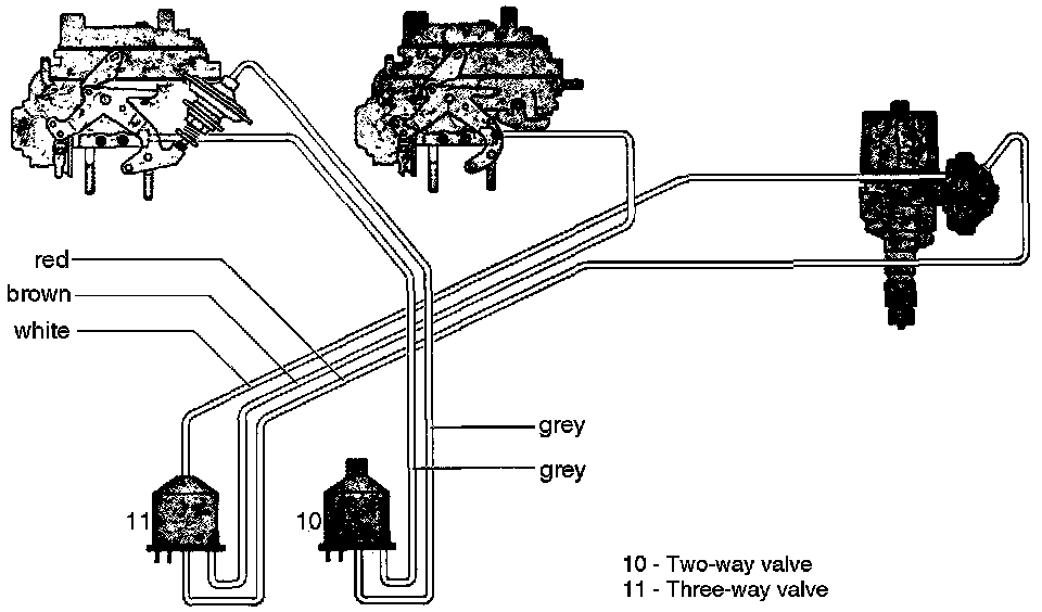 A two-way valve is installed in the vacuum line between the vacuum governor on the carburetor and the intake manifold, Fig. 11.