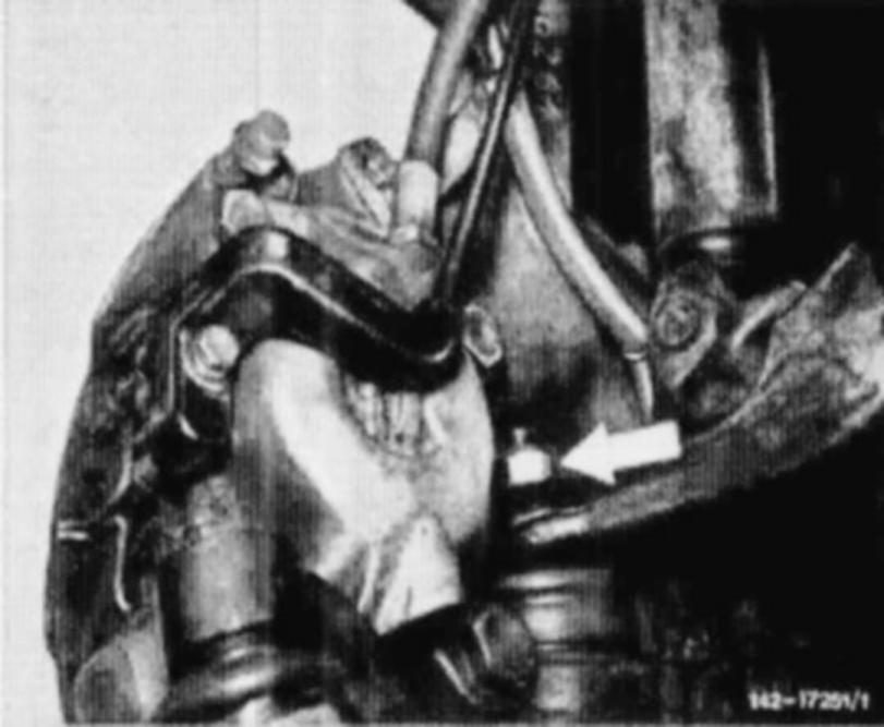 3. Unscrew brake caliper from steering knuckle and attach to torsion bar by means of a suitable hook. Do not expose brake hose to tensile stress.