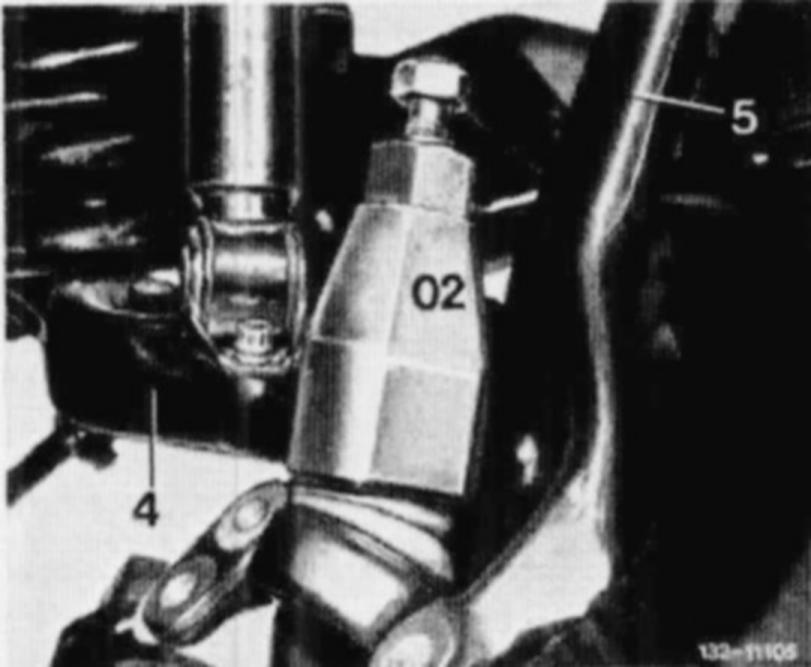 7. Swing steering knuckle (5) at top slightly outwards and force supporting joint from lower control arm (4) by means of tool (02).