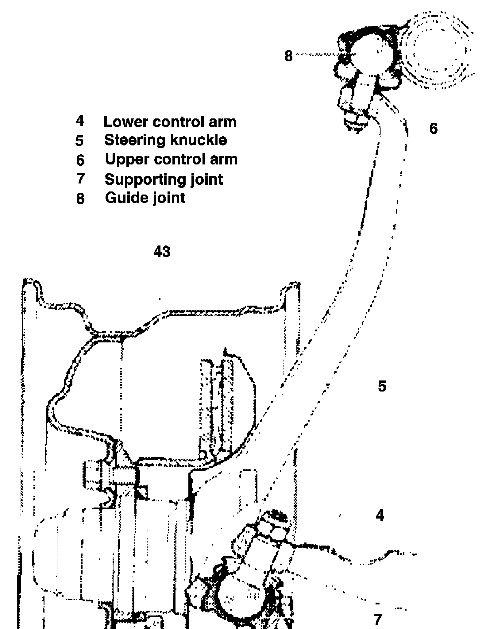 5. Loosen hex. nut on guide joint (8) and remove joint from steering knuckle by means of tool.