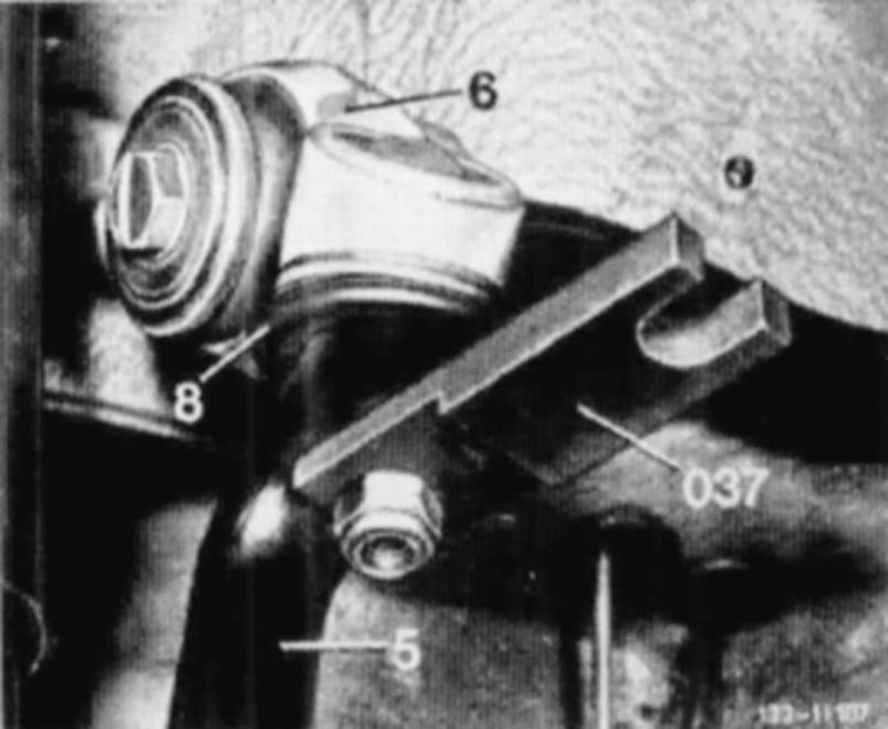 13. If the ball pin on guide or supporting joint is turning when the hex. nut is tightened insert spacing disc (037) and pull cone of ball pin into steering knuckle (5) or lower control arm (4) by tightening hex nut. Then loosen hex nut remove spacing plate and tighten hex. nut to specified torque.