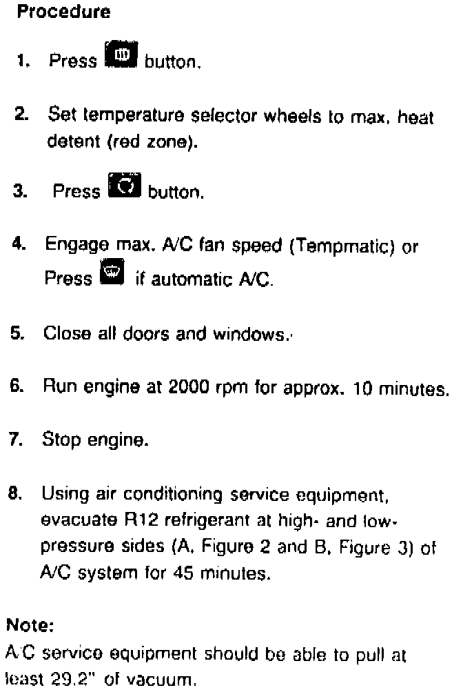 11. Using air conditioning service equipment, evacuate the R12 at high. and low-pressure sides (A, Figure 2 and B, Figure 3) of A/C system for 45 minutes.