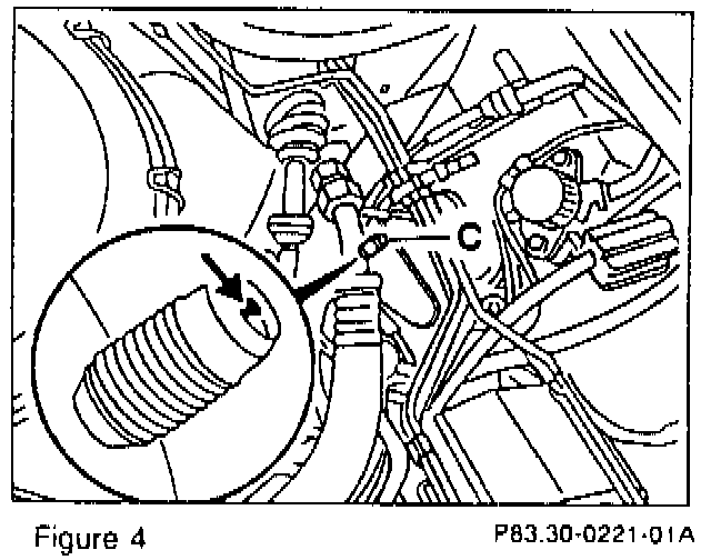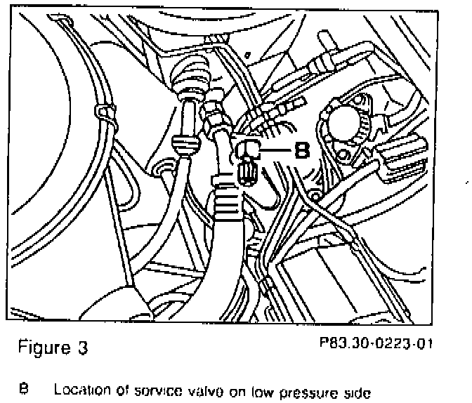Prior to the installation of the angled service valve (Figure 6) or adapter hose (4, Figure 7) the existing Schrader valve core (arrow, Figure 4) located in A/C line must be removed.