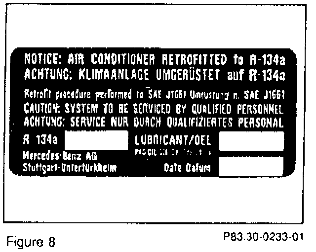 1. Using a permanent marking pen, note fill capacities of R134a refrigerant and PAG oil in the appropriate boxes of the R134a Fill Label, along with the conversion date (Figure 8).