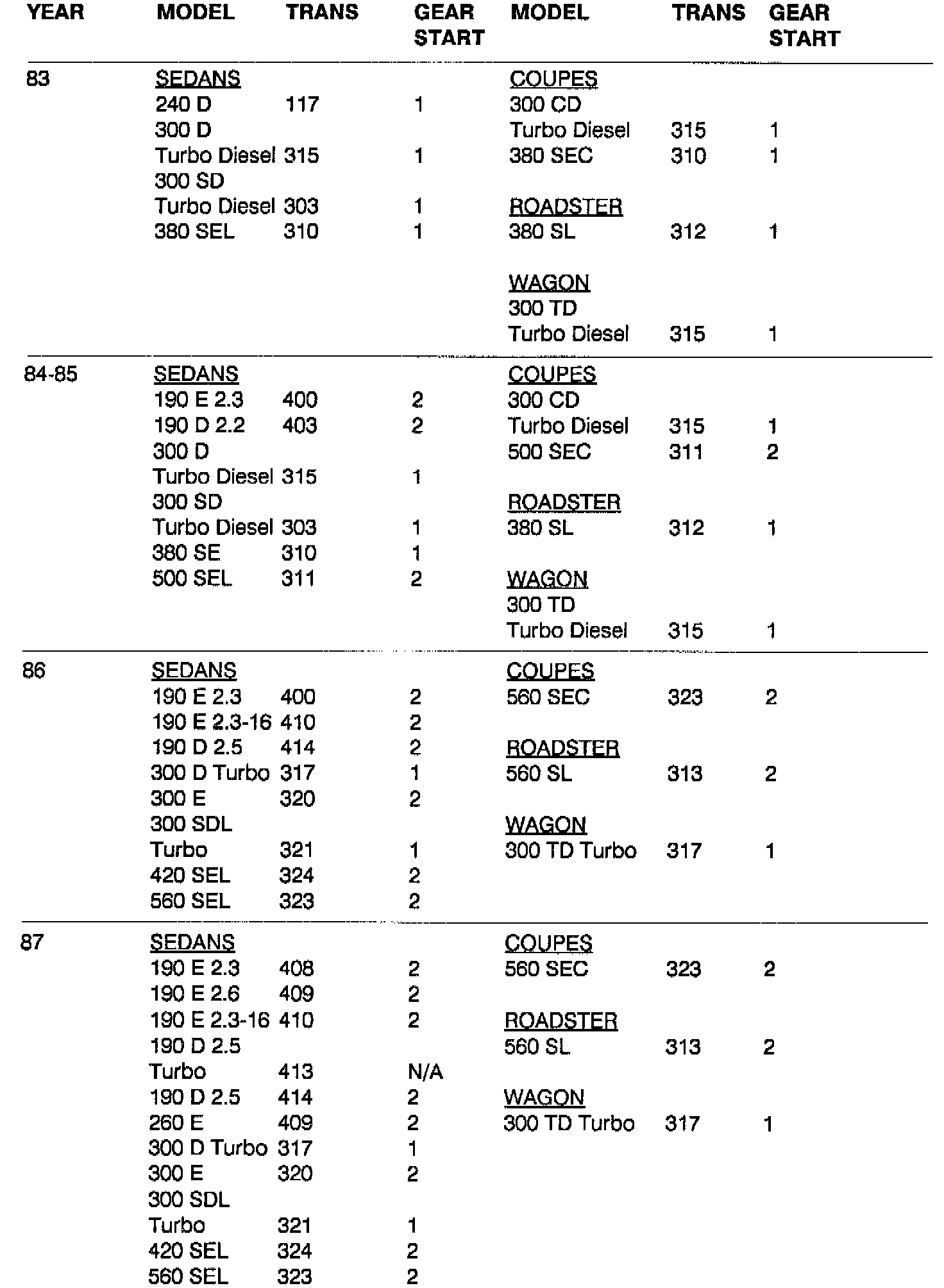 There were four basic body types: the four door sedan, the two door coupe, the two passenger roadster and the "T" sedan or wagon. The chart also show which transmission was used and whether it started in first or second gear.