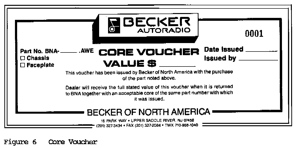 Dealer has option to establish a parts inventory or to order parts as required for each repair. BNA will issue a Core Voucher (core return authorization/credit slip) (Figure 6) with each exchange part ordered outright. If the M-B dealer submits a core part at the time of purchase, he will not be billed for a core and therefore, will not receive a Core Voucher.