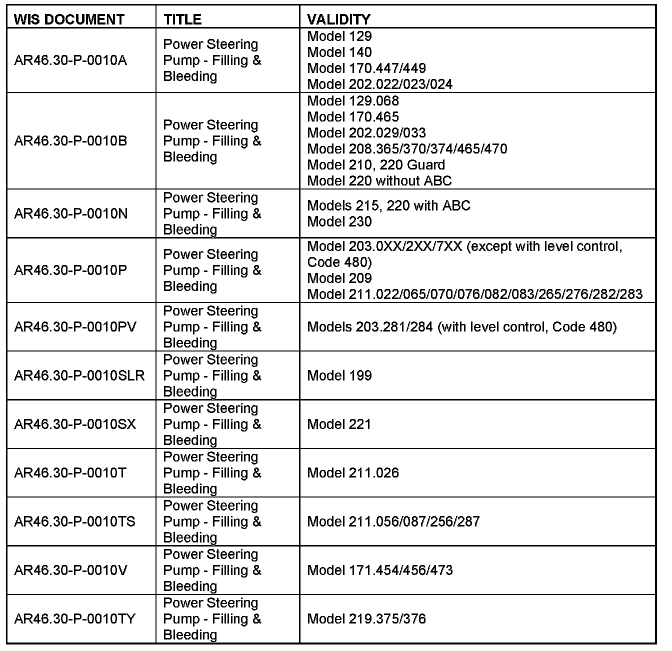 Refer to the chart shown for the correct WIS document reference for the proper filling and bleeding procedure of the power steering pump.