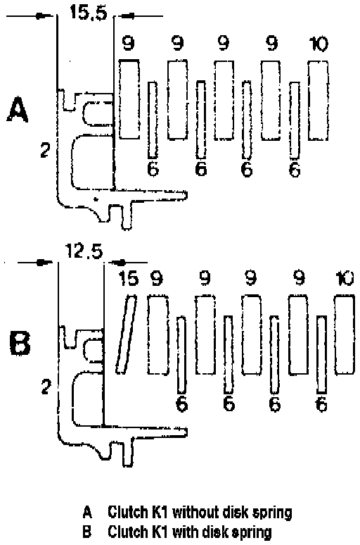 Note To improve the 2-3 shift, a disk spring (15) will be installed into clutch K1 starting September 1981. During reconditioning jobs this disk spring must be installed on principle in combination with a modified piston (2) of 12.5 mm height. If applicable, the existing piston may be turned down by 3 mm.