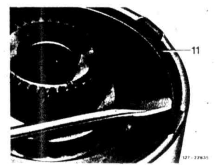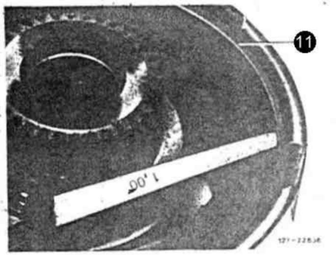 NOTE: Starting with transmission end No.243 517 clearance "A" is set by means of circlip (11) which is available in three sizes (2.0 - 2.5 - 3.0 mm thick). The groove for the circlip is therefore machined 3.2 mm wide. Additional compensation by means of center outer plates - similar to transmissions with lower transmission end No. - is required only when ever the specified clearance "A" is not attained by means of circlip (11). Set release clearance to 0.7 - 1.2 mm.
