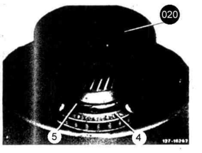 3 Place assembly fixture (020) on spring retainer (4) and tension until circlip (5) is exposed. Remove circlip (5).