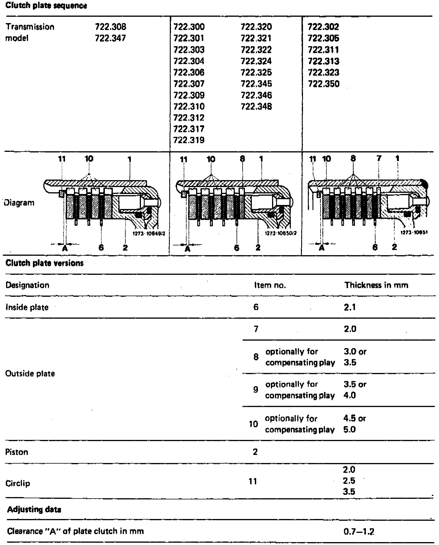 NOTE: Starting transmission end No. 243 517 clearance "A" is set by means of the circlip available in three sizes (2.0/2.5/3.0 mm thick). The groove for the circlip is machined to 3.2 mm. If the specified clearance "A" is not obtained with circlip (11), compensate additionally with center outside plates (such as transmission with lower end No.).