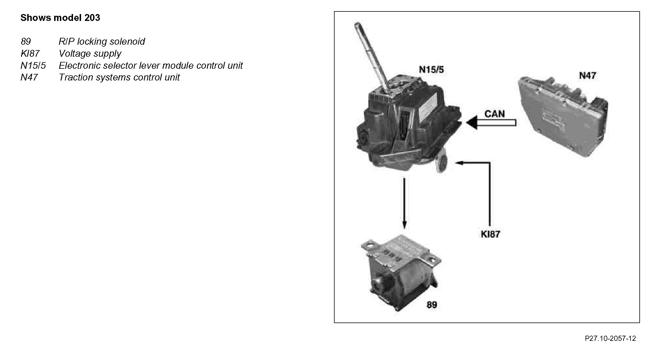 The selector lever remains locked in position "P" if the brake is not operated or there is no power supply to the electronic selector lever module (N15/5) (circuit 87).