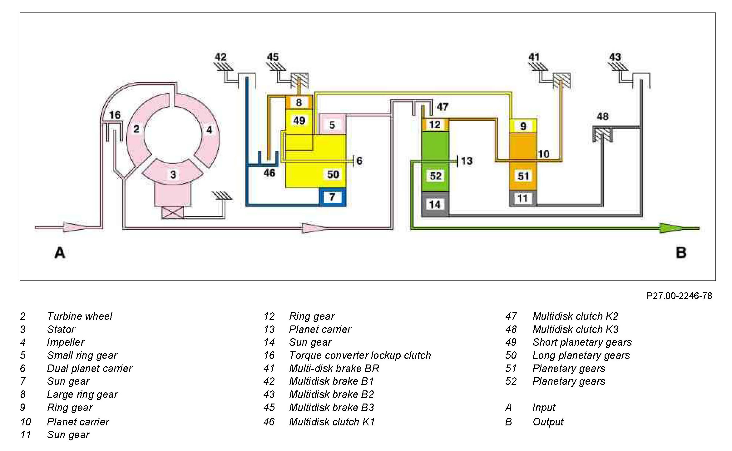 There is a connection between the sun gear (14) and sun gear (11) via the engaged multi-disk clutch K3 (48). As a result sun gear (14) rotates at the same speed and direction of rotation as sun gear (11) and drives the planetary gears (52). The increased torque and reduced rotational speed as a result are transmitted via the planet carrier (13) to the transmission output shaft. The transmission output shaft thus rotates at reduced transmission input speed opposite to the direction of the engine.