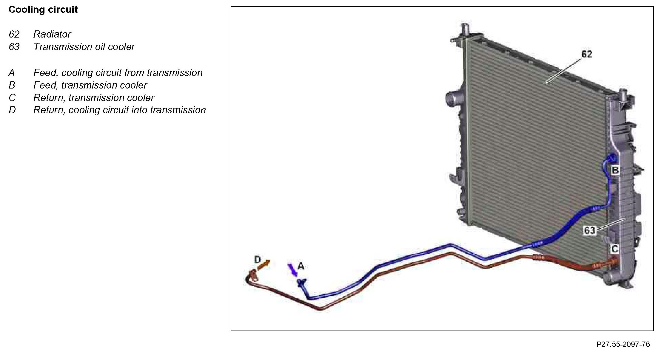 The transmission oil is drawn out of the transmission oil pan by a mechanical pump in the transmission and pumped via the feed to the transmission cooler (which is integrated in the engine radiator). The transmission oil then flows through the return line back to the transmission.