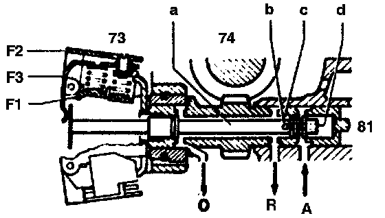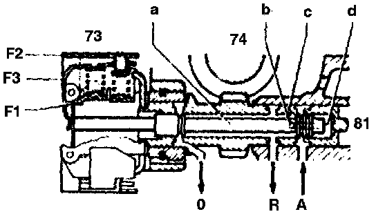 From a speed of approx. 10 km/h the zero discharge is closed and the working pressure inlet at the control edge (c) open. The governor pressure is built up by it passing through the radial drilling (b) to the end face (d). The governor pressure pushes the control valve (a) against the force of the flyweights to the left into the control position. The working pressure inlet at the control edge (c) is restricted and the zero discharge opened in order to reduce pressure.