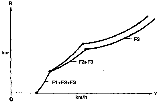 The pressure rise takes place in 3 stages, see diagram. The flyweights F1 and F2 are supported on the governor housing as a function of vehicle speed and thus have no effect on the further rise in pressure.