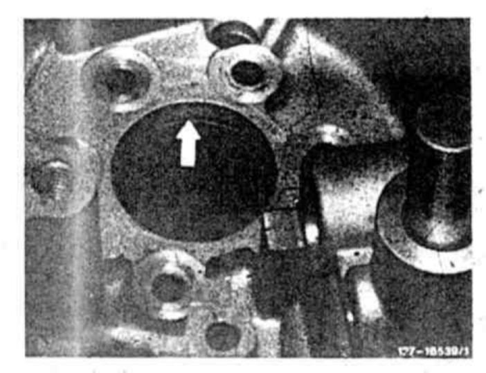 Thrust bearing B2 with oil drain bore turned in downward direction (arrow) only in combination with brake band guide with additional oil drain bore (arrow). Installed starting transmission end no. 825 583.