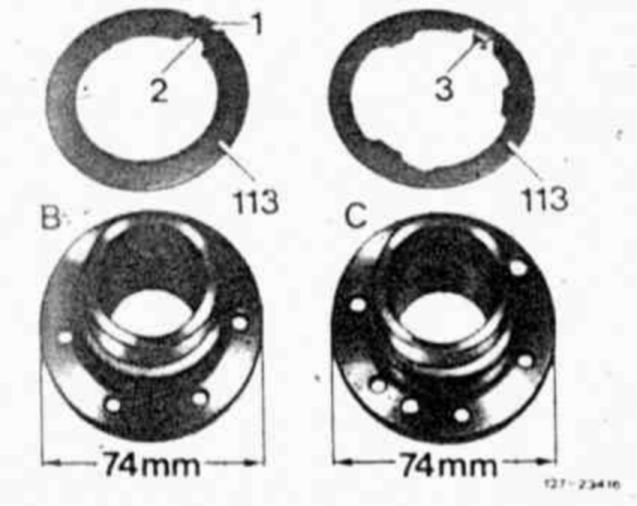 Supporting flange K2 without lube bore with thrust washer (113) and locating lug (3) inside. Installed starting transmission end No. 101853. Version "C" will he installed in vehicles with engine 117 starting transmission end No. 393445.