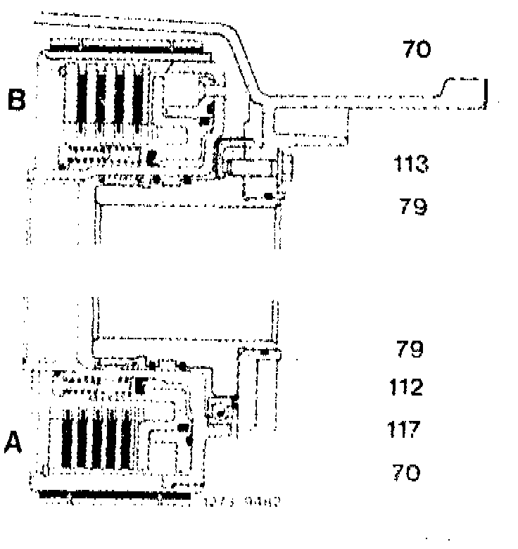 NOTE: Starting transmission end No. 53854 supporting flange K 2 3rd version (C) with thrust washer (113) 2nd version (B) is installed. Clutch K 2 is guided axially either by way of radial ball bearing (version "A") or a thrust washer (version "B"). For version "A", a steel washer (112) is placed on supporting flange (79), for version "B", a brass-coated thrust washer (113).