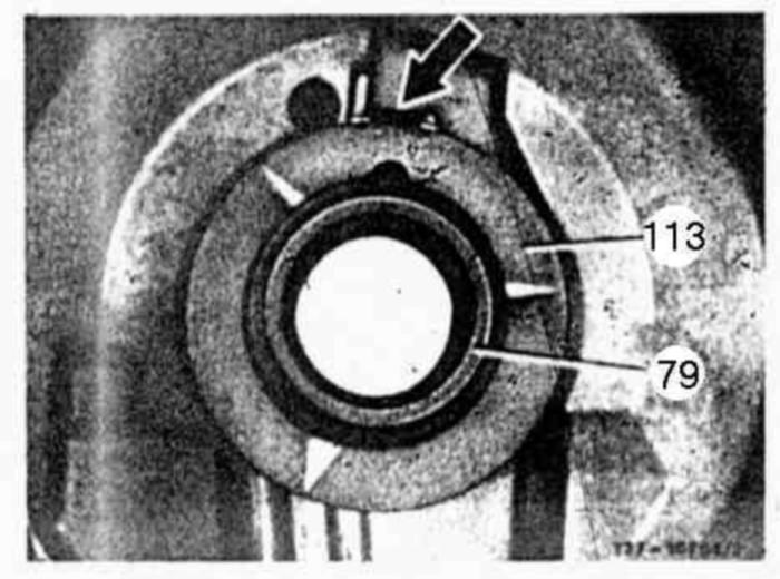 71 Insert steel or thrust washer. Insert thrust washer (113) in such a manner that the plate for torsion lock (arrow) is fixed in housing.