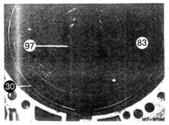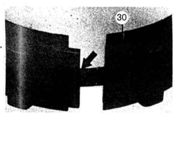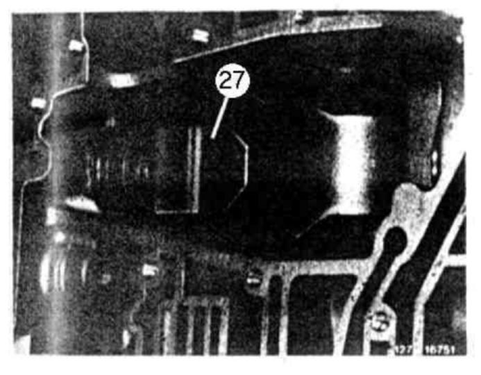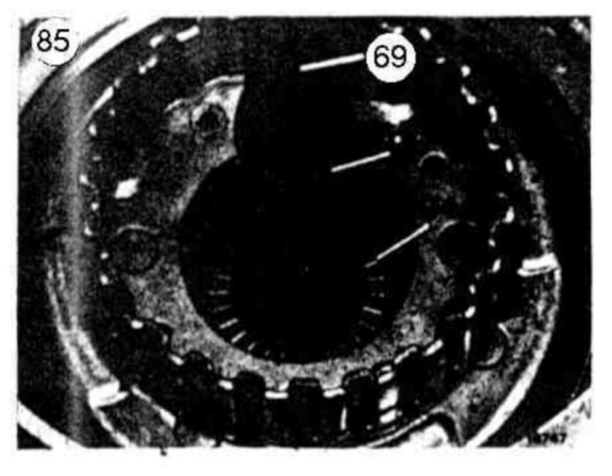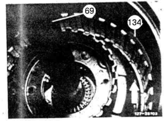 86 Inset brake band B1 (30) in such a manner that pin of assembly lock (arrow) in Fig. item 84 is facing thrust body B1.