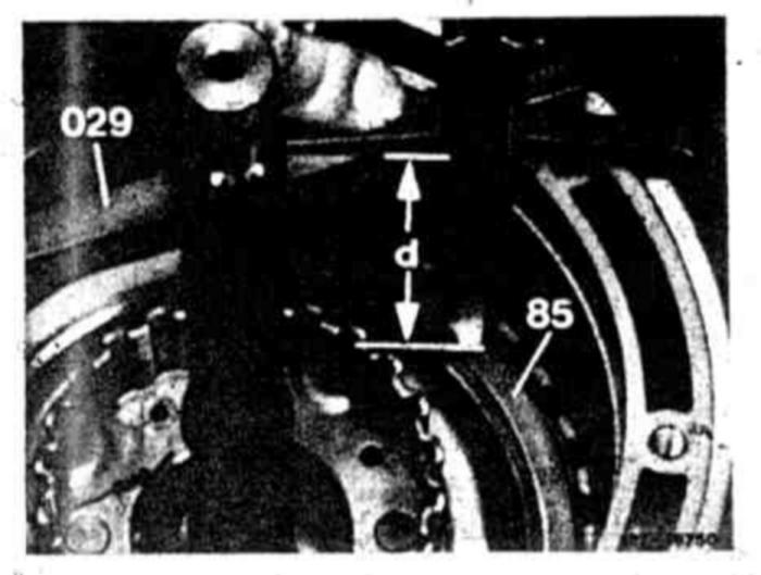 Place parallel bar (029) on piston of multiple-disk brake (12), measure by means of depth gauge in relation to gasket (19). The difference between the two dimensions provides the release clearance "L". Set release clearance "L" to its nominal value of 1.5-2.0 mm. Compensation is made by means of outside plates and compensating washers (85) of varying thickness.