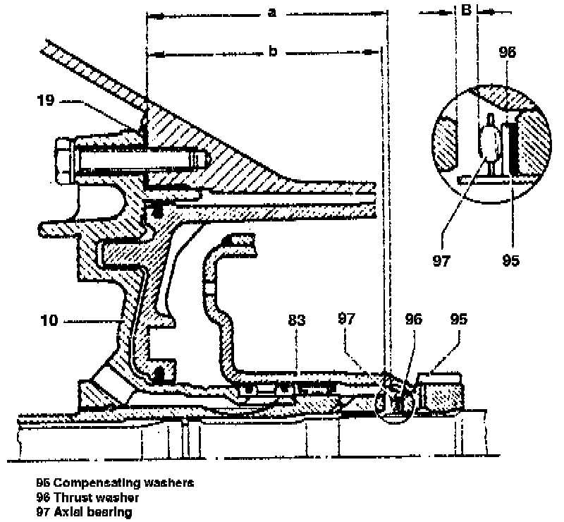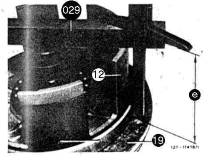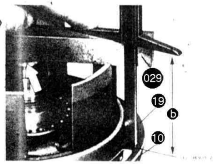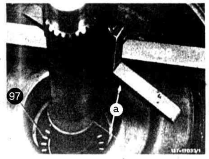 Place parallel bar (029) on machined surface. Measure by means of depth gauge from parallel bar in relation to a roller of axial bearing (97) (dimension "a"). The difference between the two measurements is play "B". Adjust play by inserting pertinent shims (95) under thrust washer (96) of axial bearing (97) (refer to drawing item 94).