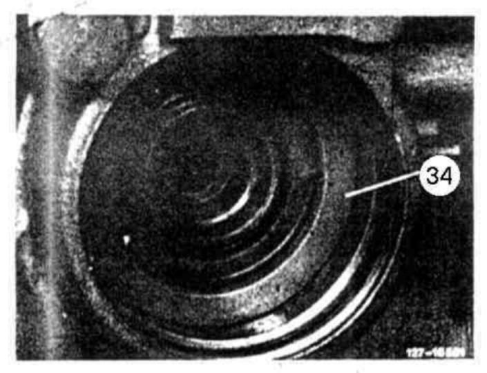 Thrust bearing B2 with enlarged stroke, identification for elimination of ring groove (arrow) in combination with brake band piston B2 with ring groove (arrow) on spring retainer. Installed starting transmission end no. 909 459