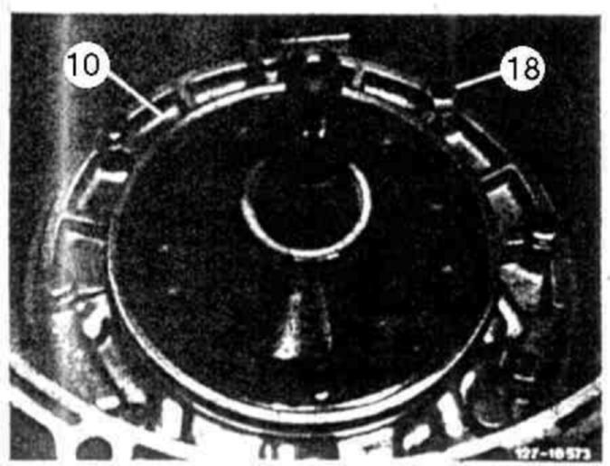 NOTE: On vehicles with gasoline engine (Japan,USA) starting 1988 a spring retainer is mounted instead of compensating washer (5).