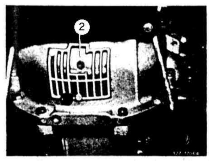 9 Unscrew drain plug on torque converter (2) and drain oil.