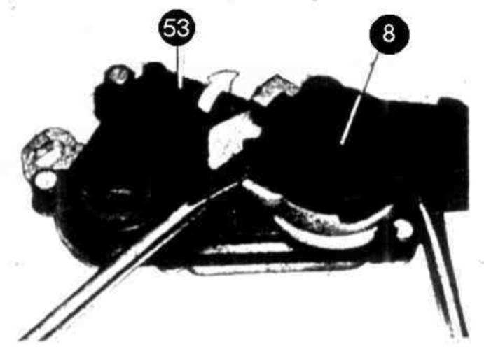 The plug for the starter lockout switch (8) is secured by a lock (white plastic ring). Prior to pushing off plug, turn lock in upward direction (direction of arrow). Carefully push off plug at cable outlet and tongue by means of two screw drivers.