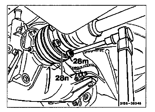 Note: On models 126.03/04 up to approx. beginning of 10/85 the three hex. head bolts for mounting the joint plate on the joint flange must be installed from the rear toward the front for reasons of space. The bolts can only be inserted when the joint flange is located at the same height as the point on the rear axle housing marked with an arrow.