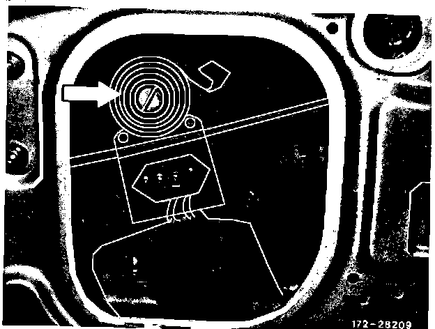 3.. Remove the compensating spring with the spring mounting tool, part no. 900 589 00 62 00. Place the tool slot over the end of the spring (arrow). Wind-up the spring clockwise, lift it carefully over the engaging tab, and slowly release the spring tension (Figure 2).