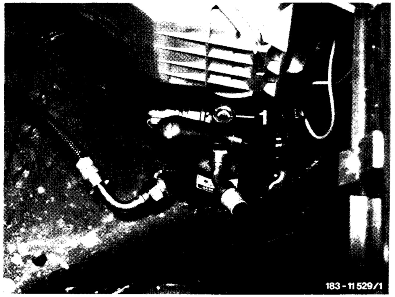 2. Start vehicle and push function selection "c" and run engine at idle. Observe sight glass (1) in receiver drier after a/c compressor clutch engages. Refrigerant flow should be free of bubbles shortly after system engages. If refrigerant is insufficient (bubbles in sight glass), fill system. If more than 200 grams is needed, leak test system.