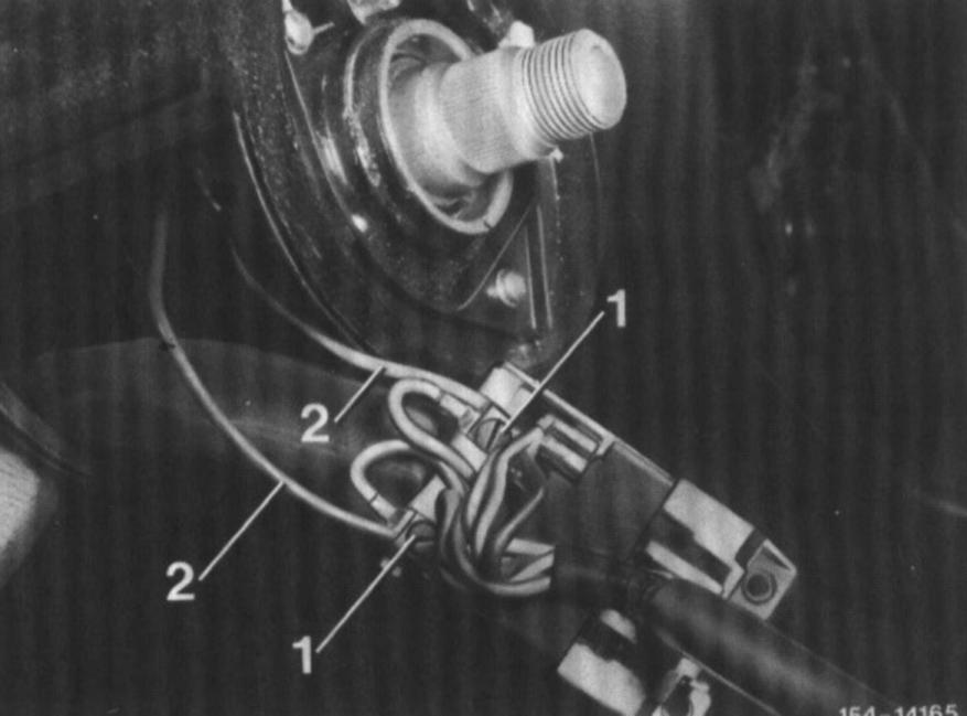 3 Slightly pull out combination switch, loosen screws (1) for cable connection of twin carbon contacts and pull out cable (2).
