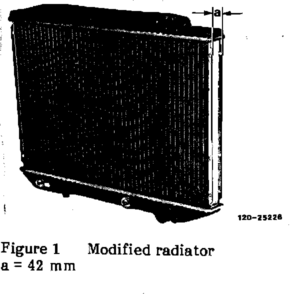 As of late May 1982 production on model 380 SEL and early August 1982 production on model 380 SEC, radiators with a core thickness of 42 mm (Figure 1, dimension "a" previously 34 mm) have been installed. In addition, a modified condenser is also installed in model 380 SEC, due to space limitations with the new radiator (see Figures 2 and 3, arrows).
