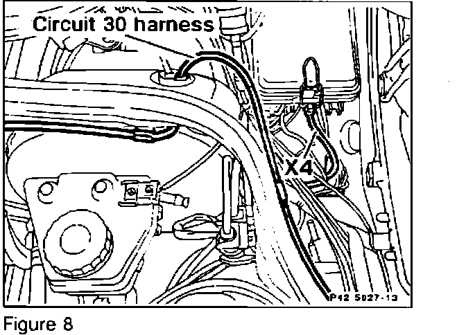 4. Locate circuit 30 wire (4 sq.mm) for relay module (N14) at X4 location (beneath front fuse box). This wire is joined with a 6 sq.mm wire in a single ring terminal (Figure 8).