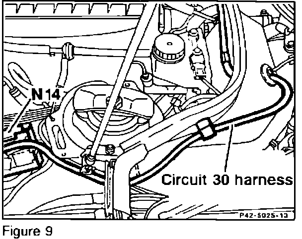 through compartment wall grommet (maximum distance from ABS wiring harness), along rear inside of wall to grommet above brake booster (Figure 9).