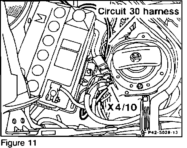 10. Continue through the compartment wall with the starter wiring harness, then to the battery connector (X35 or X4 10) (Figure 11).
