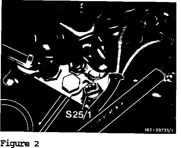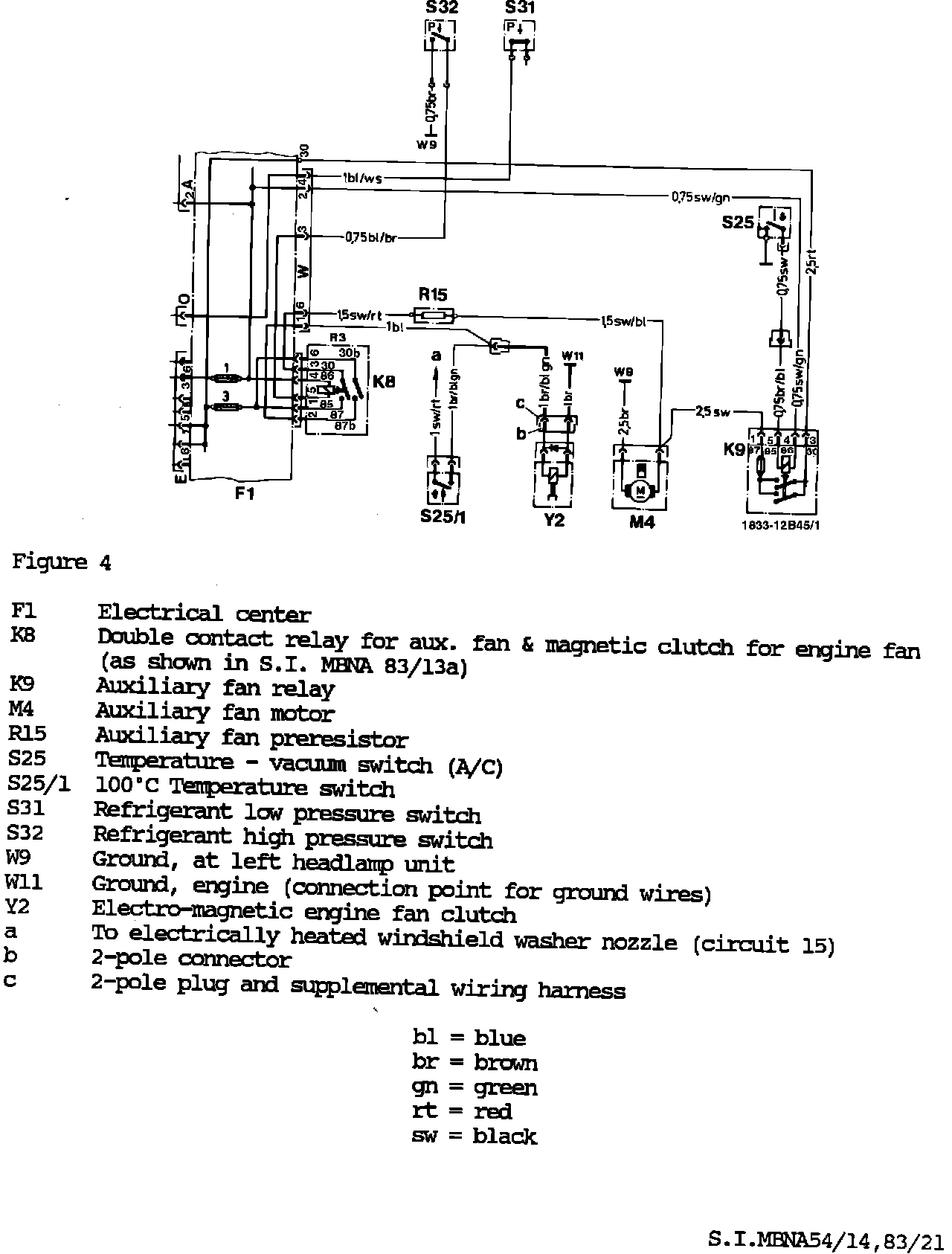 Beginning with model year 1985, a modified electrical center (Figure 1) was phased in since the polarity of the switch for the electro-magnetic engine fan coupling was reversed from negative to positive. At the same time the 100°C temperature switch (S25/1, Figure 2) has been changed from a 1-pole to a 2- pole version.