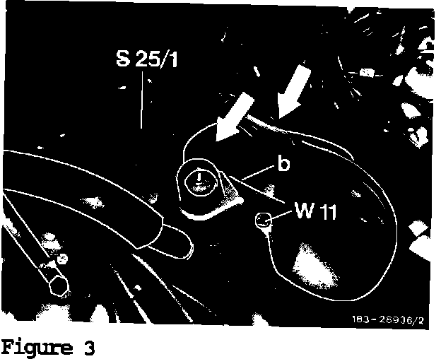 3. Remove 2-pole plug (left arrow) from connector (b) and reconnect it to temperature switch (S25/1).