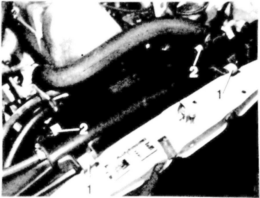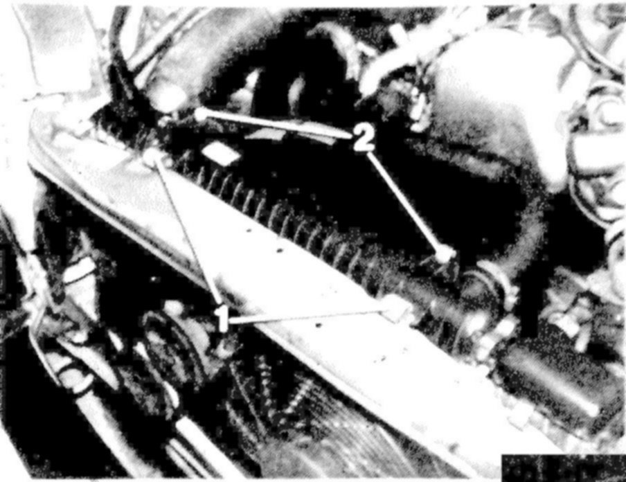 8 Pull out both holding clamps (1) in upward direction and lift out radiator together with air-oil cooler.