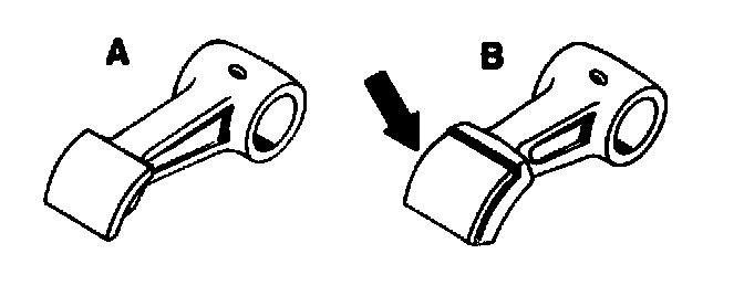 Rocker arm with brazed-on carbide facing as running surface (B, arrow), for camshafts made of chilled cast iron (code number 05 and 08).