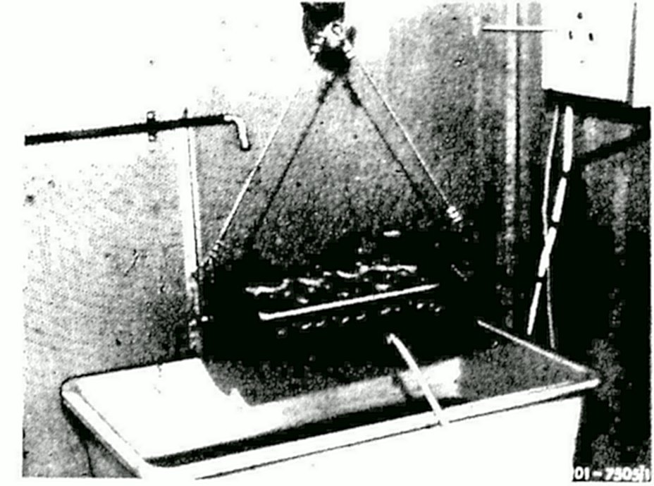 4 Fasten cylinder head to suspension fixture and dip into heated water tank (80 °C)