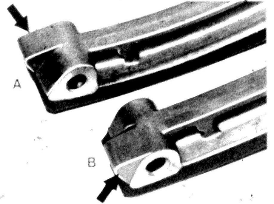 On the other hand, the tensioning rail of this engine is pointed at upper end (A) and has an 6 mm bore in upper part.