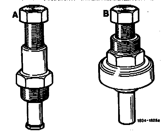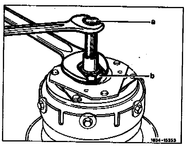 5. Use a wrench to hold the threaded sleeve (b) in place and turn bolt (a) until the spring plate can be removed.