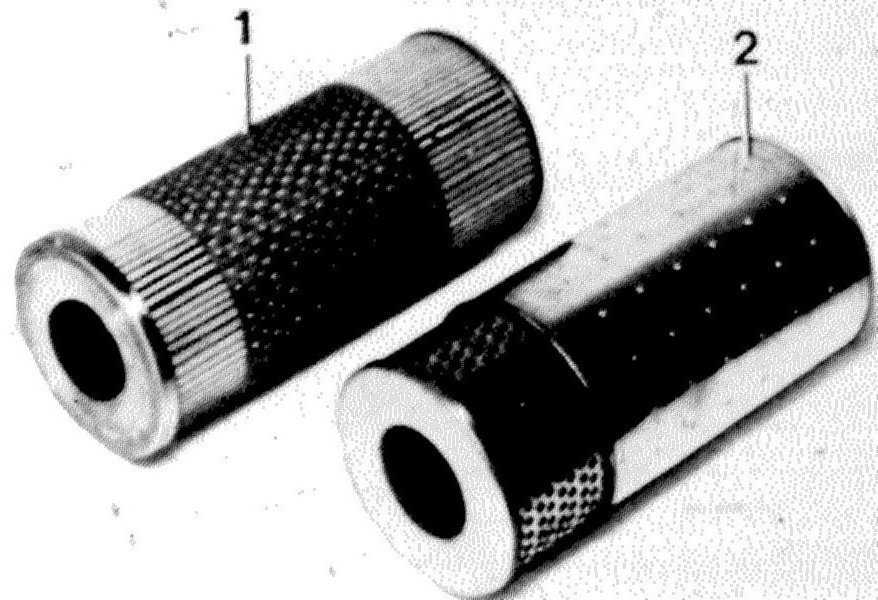 During first inspection (1000-1500 km or 800-1000 miles) the initial operation oil filter element (1) should be replaced by the combination filter element (2).